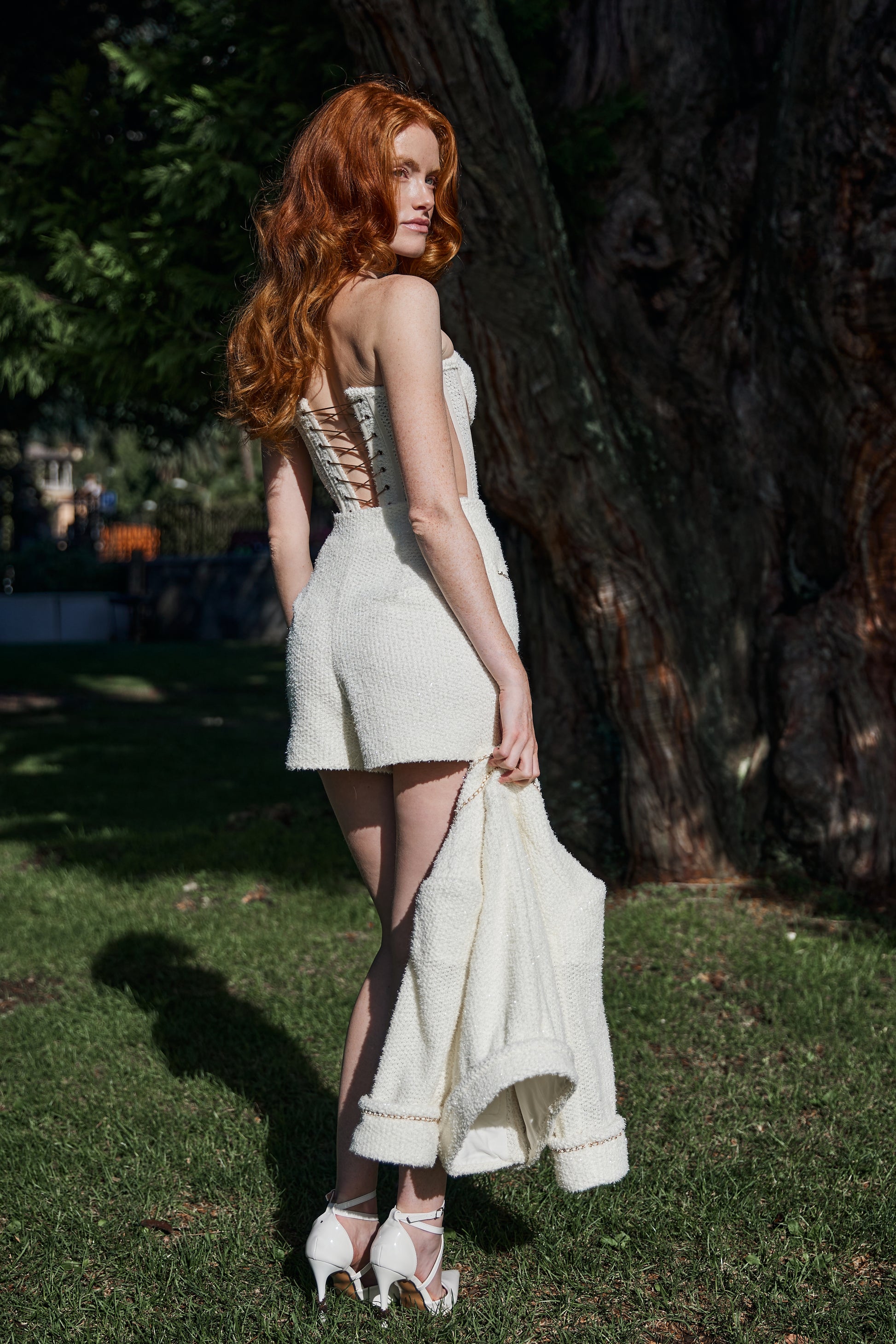 Three-piece set – Corset crafted from a mix of shiny tweed Italian fabric and skin-tone tulle, featuring a side zipper and adjustable back. Paired with shorts detailed with handmade chains and a uniquely designed jacket.